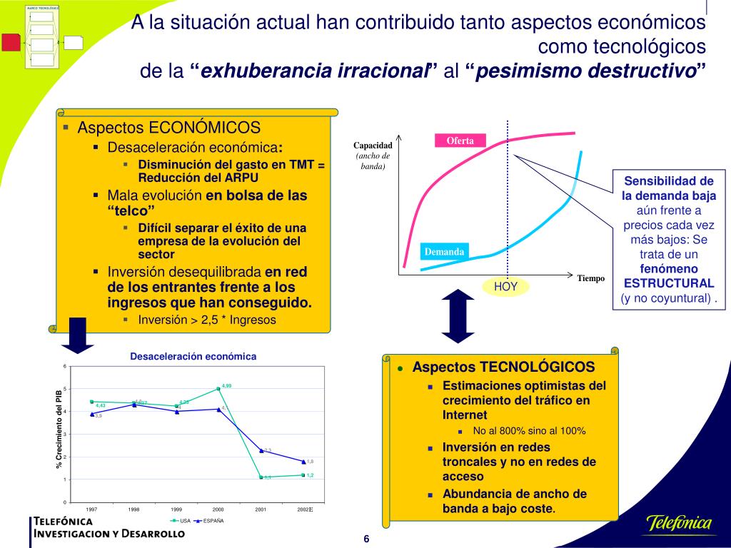 Aspectos ECONÓMICOS Desaceleración económica: Disminución del gasto en TMT = Reducción del ARPU Mala evolución en bolsa de las “telco” Difícil separar el éxito de una empresa de la evolución del sector Inversión desequilibrada en red de los entrantes frente a los ingresos que han conseguido. Inversión > 2,5 * Ingresos MARCO TECNOLÓGICO A la situación actual han contribuido tanto aspectos económicos como tecnológicos de la “exhuberancia irracional” al “pesimismo destructivo” Sensibilidad de la demanda baja aún frente a precios cada vez más bajos: Se trata de un fenómeno ESTRUCTURAL (y no coyuntural) . • Aspectos TECNOLÓGICOS • Estimaciones optimistas del crecimiento del tráfico en Internet • No al 800% sino al 100% • Inversión en redes troncales y no en redes de acceso • Abundancia de ancho de banda a bajo coste.