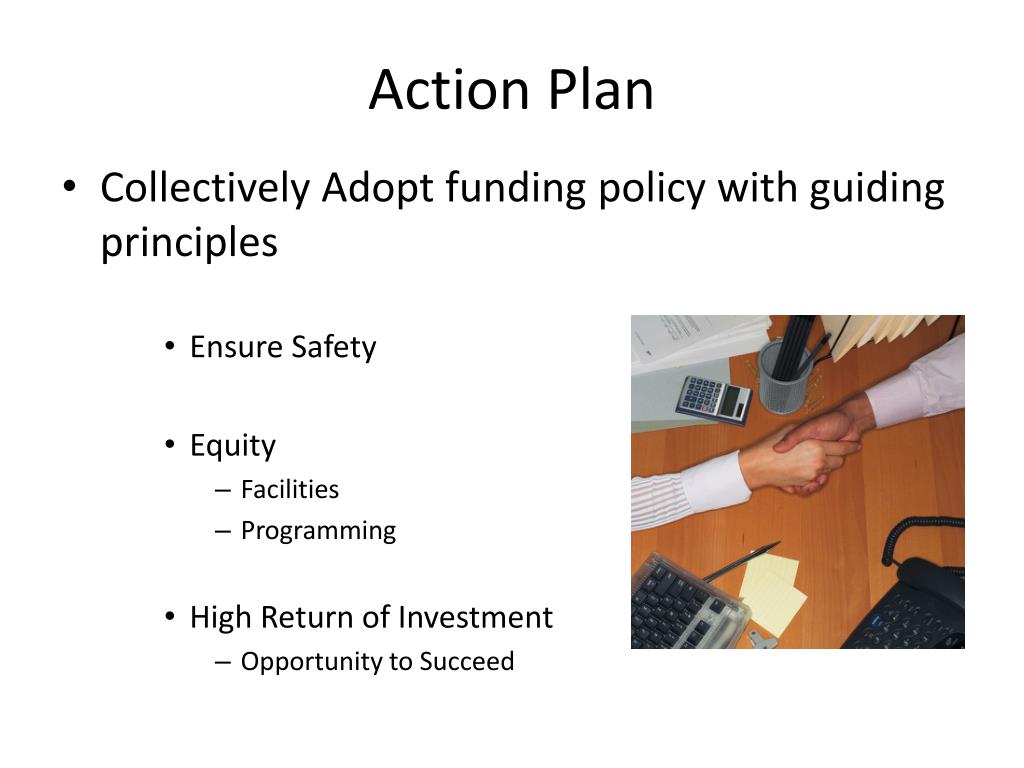 Action Plan • Collectively Adopt funding policy with guiding principles • Ensure Safety • Equity • Facilities • Programming • High Return of Investment • Opportunity to Succeed