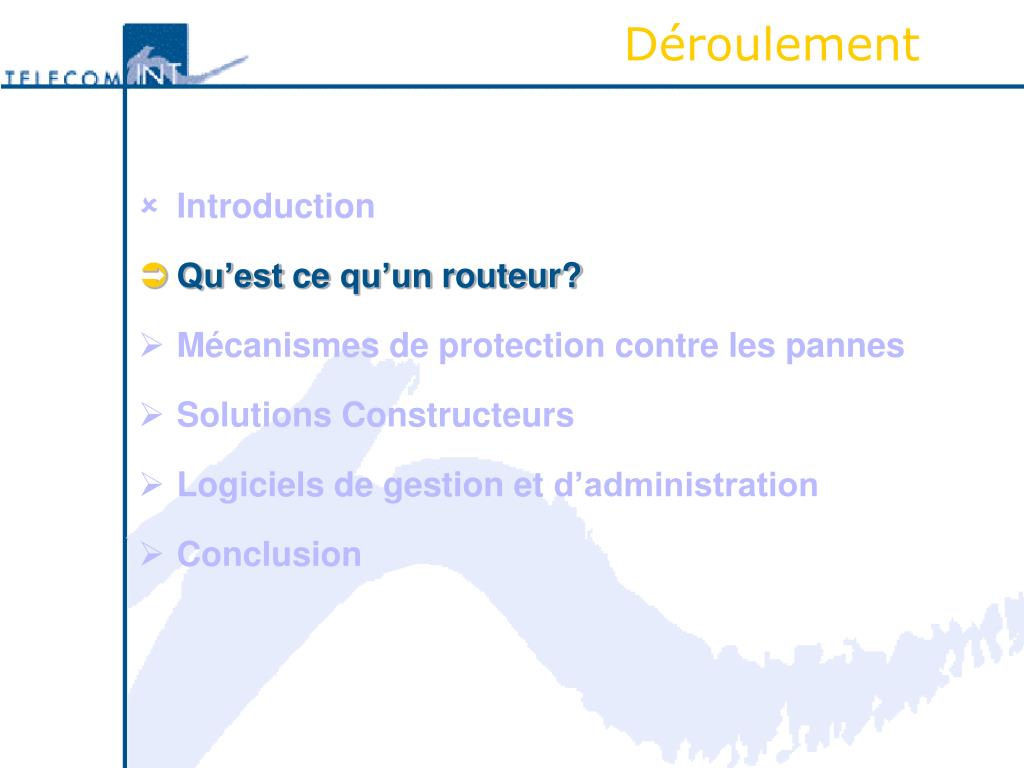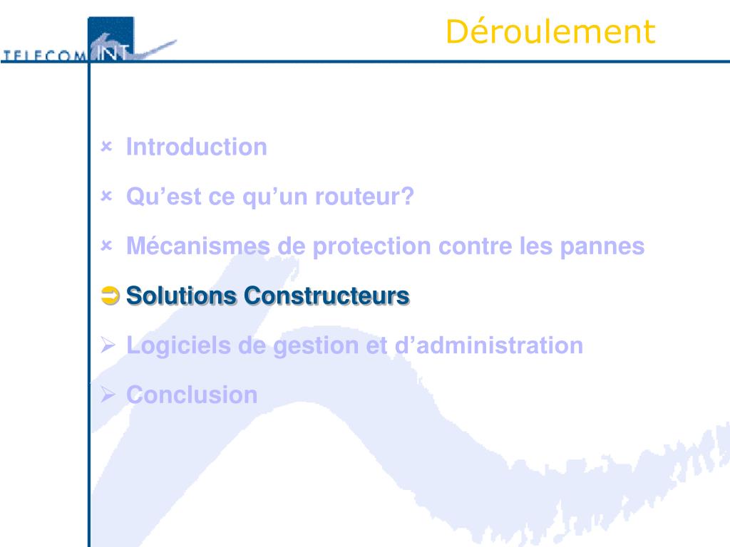 Déroulement • Introduction • Qu’est ce qu’un routeur? • Mécanismes de protection contre les pannes • Solutions Constructeurs • Logiciel de gestion et d’administration logicielle • Conclusion