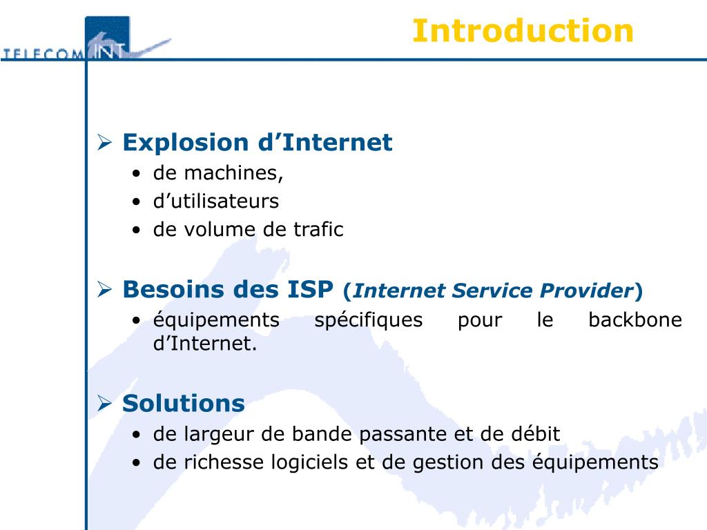 Introduction • Explosion d’Internet • de machines, • d’utilisateurs • de volume de trafic • Besoins des ISP (Internet Service Provider) • équipements spécifiques pour le backbone d’Internet. • Solutions • de largeur de bande passante et de débit • de richesse logiciels et de gestion des équipements