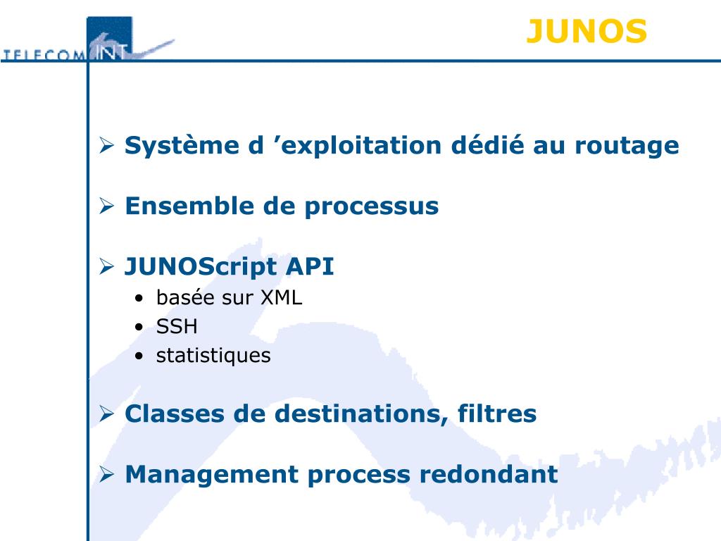 JUNOS • Système d ’exploitation dédié au routage • Ensemble de processus • JUNOScript API • basée sur XML • SSH • statistiques • Classes de destinations, filtres • Management process redondant