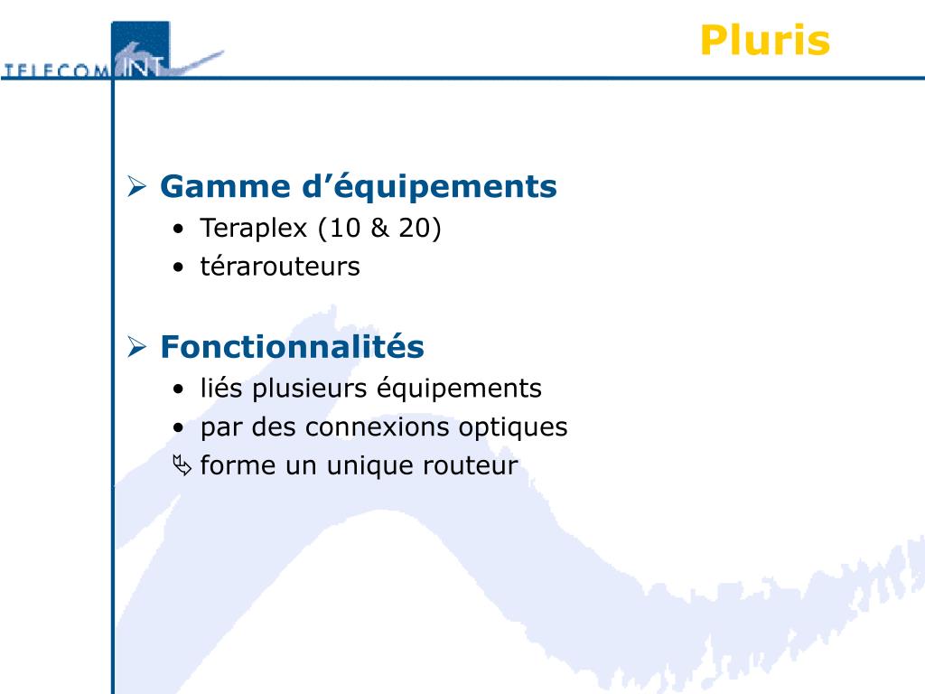 Pluris • Gamme d’équipements • Teraplex (10 & 20) • térarouteurs • Fonctionnalités • liés plusieurs équipements • par des connexions optiques • forme un unique routeur