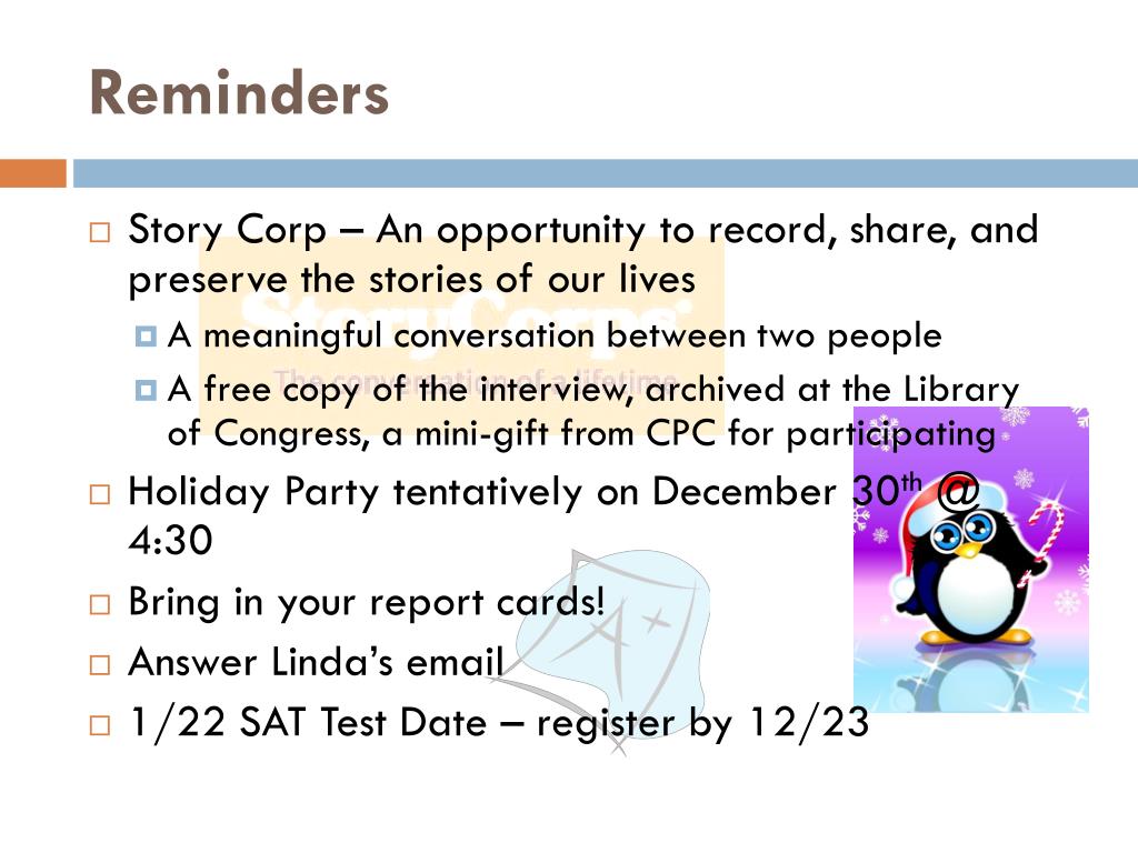 Reminders • Story Corp – An opportunity to record, share, and preserve the stories of our lives • A meaningful conversation between two people • A free copy of the interview, archived at the Library of Congress, a mini-gift from CPC for participating • Holiday Party tentatively on December 30th @ 4:30 • Bring in your report cards! • Answer Linda’s email • 1/22 SAT Test Date – register by 12/23