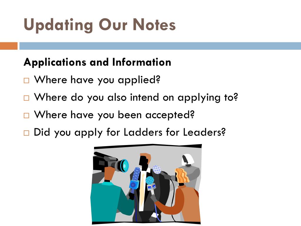 Updating Our Notes Applications and Information • Where have you applied? • Where do you also intend on applying to? • Where have you been accepted? • Did you apply for Ladders for Leaders?