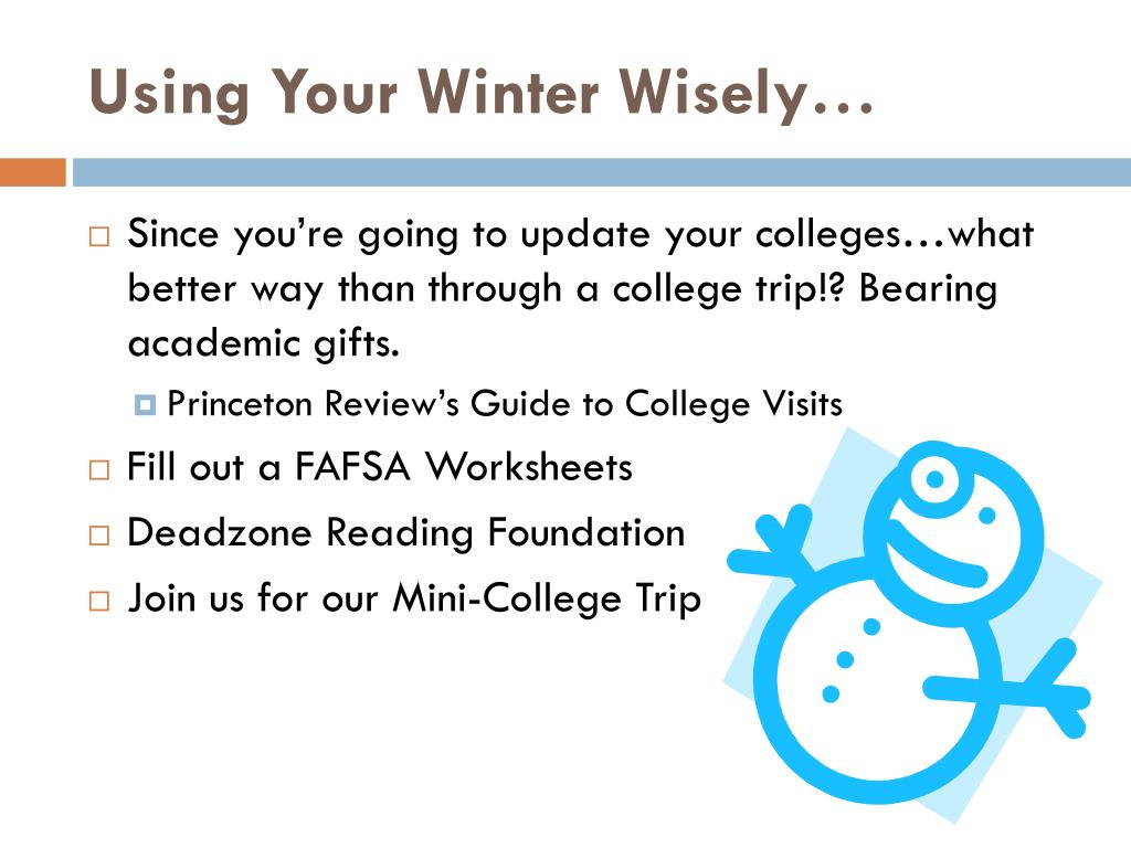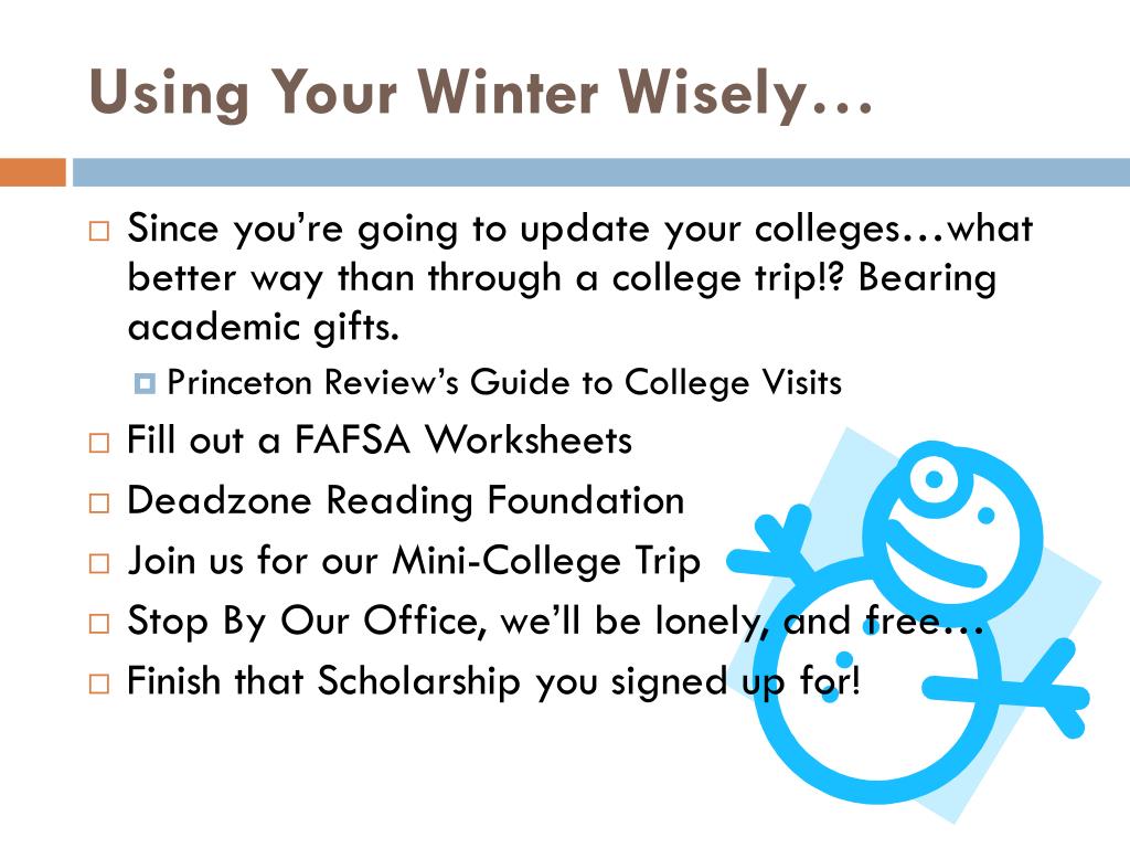 Using Your Winter Wisely… • Since you’re going to update your colleges…what better way than through a college trip!? Bearing academic gifts. • Princeton Review’s Guide to College Visits • Fill out a FAFSA Worksheets • Deadzone Reading Foundation • Join us for our Mini-College Trip • Stop By Our Office, we’ll be lonely, and free… • Finish that Scholarship you signed up for!