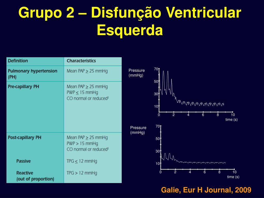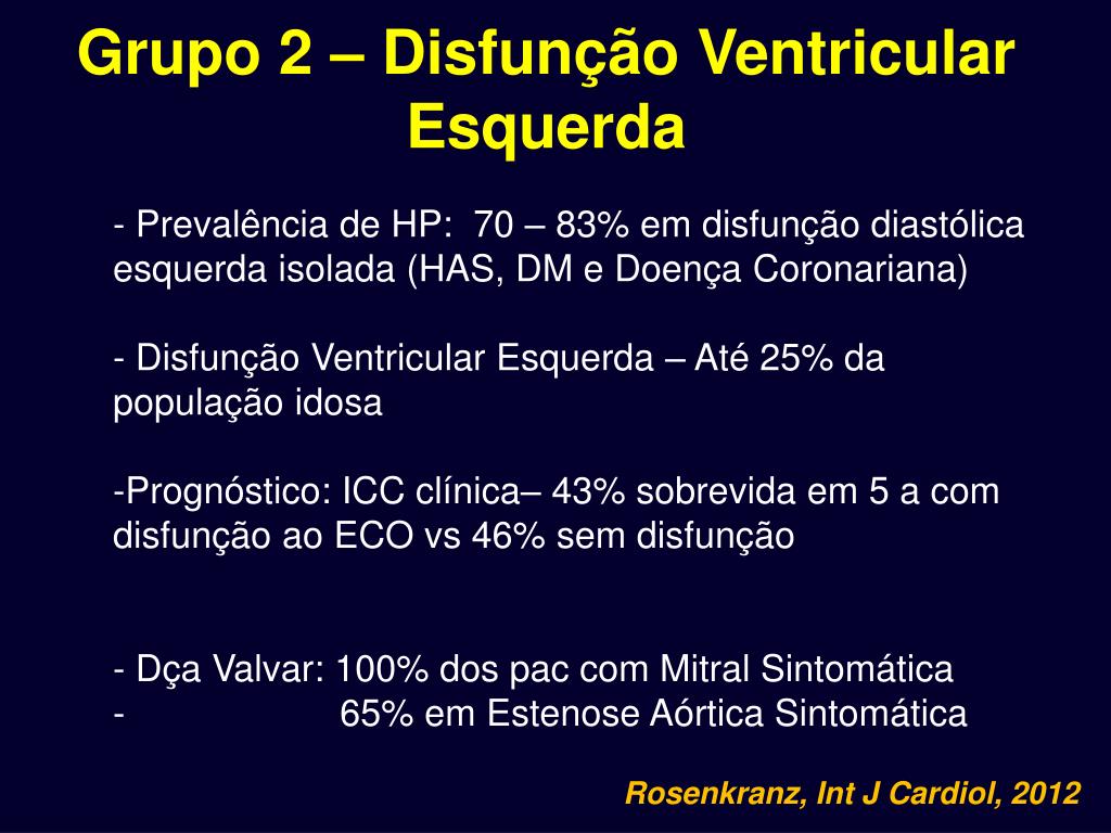Grupo 2 – Disfunção Ventricular Esquerda • Prevalência de HP: 70 – 83% em disfunção diastólica esquerda isolada (HAS, DM e Doença Coronariana) • Disfunção Ventricular Esquerda – Até 25% da população idosa • Prognóstico: ICC clínica– 43% sobrevida em 5 a com disfunção ao ECO vs 46% sem disfunção • Dça Valvar: 100% dos pac com Mitral Sintomática • 65% em Estenose Aórtica Sintomática Rosenkranz, Int J Cardiol, 2012