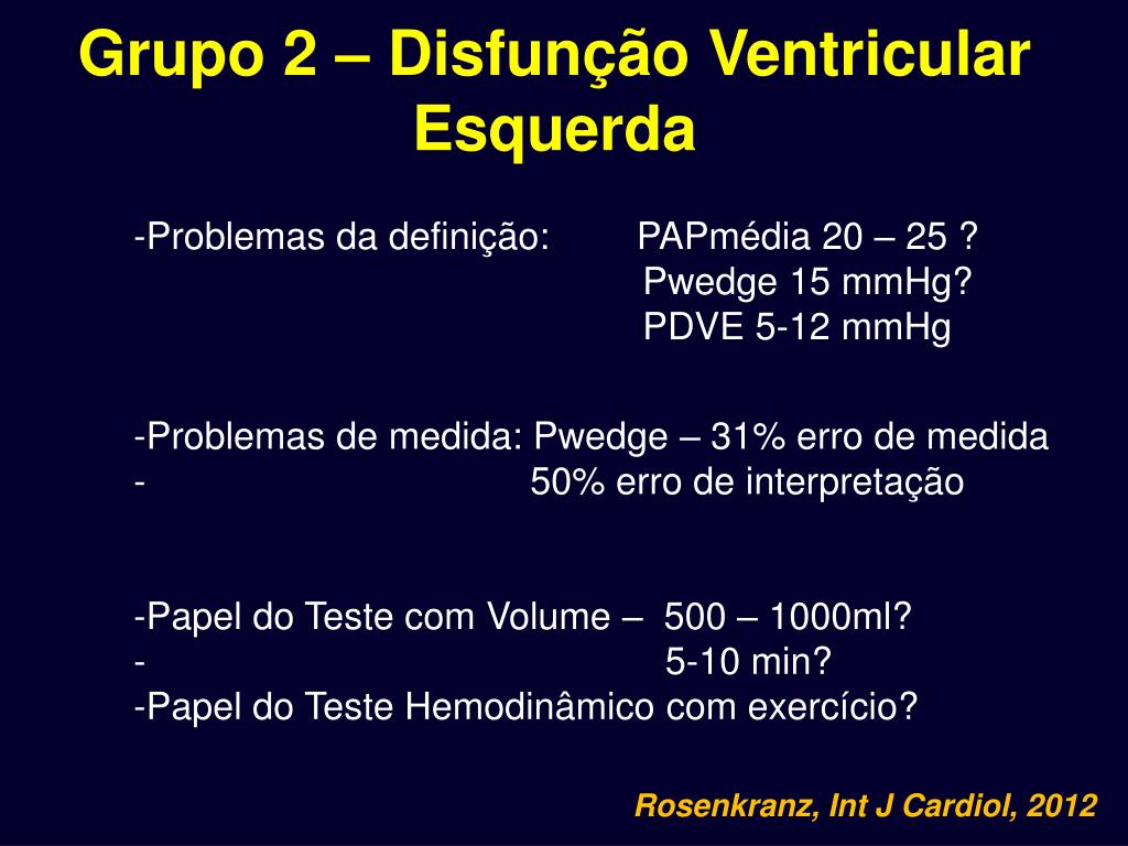 Grupo 2 – Disfunção Ventricular Esquerda • Problemas da definição: PAPmédia 20 – 25 ? • Pwedge 15 mmHg? • PDVE 5-12 mmHg • Problemas de medida: Pwedge – 31% erro de medida • 50% erro de interpretação • Papel do Teste com Volume – 500 – 1000ml? • 5-10 min? • -Papel do Teste Hemodinâmico com exercício? Rosenkranz, Int J Cardiol, 2012
