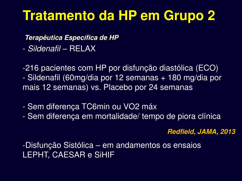 Tratamento da HP em Grupo 2 Terapêutica Específica de HP • Sildenafil – RELAX • 216 pacientes com HP por disfunção diastólica (ECO) • Sildenafil (60mg/dia por 12 semanas + 180 mg/dia por mais 12 semanas) vs. Placebo por 24 semanas • Sem diferença TC6min ou VO2 máx • Sem diferença em mortalidade/ tempo de piora clínica • Disfunção Sistólica – em andamentos os ensaios LEPHT, CAESAR e SiHIF Redfield, JAMA, 2013