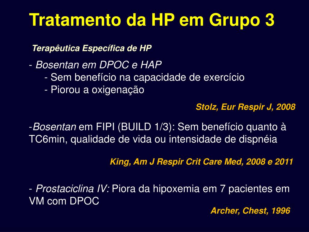 Tratamento da HP em Grupo 3 Terapêutica Específica de HP • Bosentan em DPOC e HAP • Sem benefício na capacidade de exercício • Piorou a oxigenação • Bosentan em FIPI (BUILD 1/3): Sem benefício quanto à TC6min, qualidade de vida ou intensidade de dispnéia • Prostaciclina IV: Piora da hipoxemia em 7 pacientes em VM com DPOC Stolz, Eur Respir J, 2008 King, Am J Respir Crit Care Med, 2008 e 2011 Archer, Chest, 1996