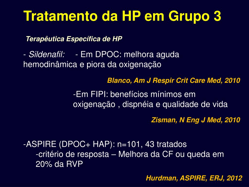 Tratamento da HP em Grupo 3 Terapêutica Específica de HP • Sildenafil: - Em DPOC: melhora aguda hemodinâmica e piora da oxigenação • Em FIPI: benefícios mínimos em oxigenação , dispnéia e qualidade de vida • ASPIRE (DPOC+ HAP): n=101, 43 tratados • critério de resposta – Melhora da CF ou queda em 20% da RVP Blanco, Am J Respir Crit Care Med, 2010 Zisman, N Eng J Med, 2010 Hurdman, ASPIRE, ERJ, 2012
