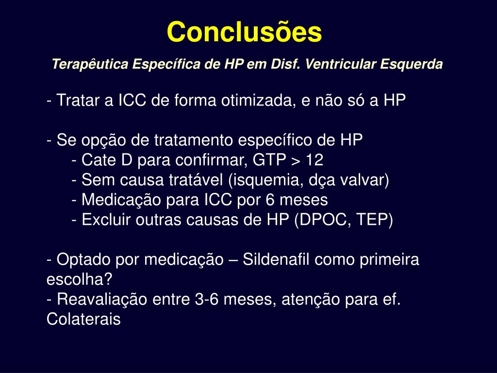Conclusões Terapêutica Específica de HP em Disf. Ventricular Esquerda • Tratar a ICC de forma otimizada, e não só a HP • Se opção de tratamento específico de HP • Cate D para confirmar, GTP > 12 • Sem causa tratável (isquemia, dça valvar) • Medicação para ICC por 6 meses • Excluir outras causas de HP (DPOC, TEP) • Optado por medicação – Sildenafil como primeira escolha? • Reavaliação entre 3-6 meses, atenção para ef. Colaterais