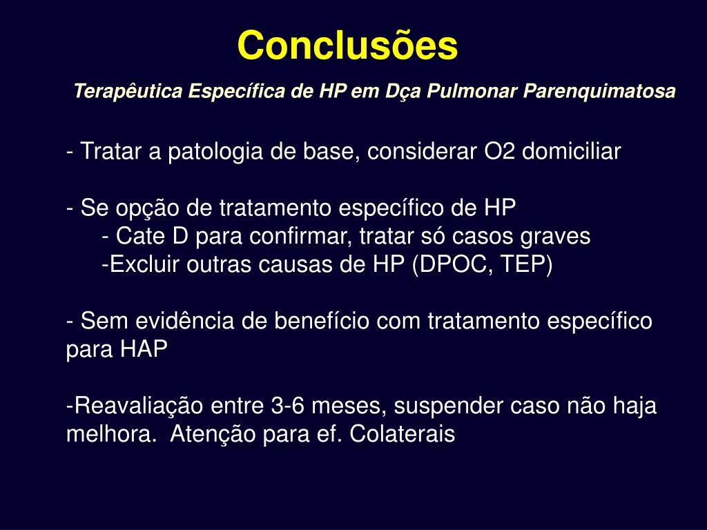 Conclusões Terapêutica Específica de HP em Dça Pulmonar Parenquimatosa • Tratar a patologia de base, considerar O2 domiciliar • Se opção de tratamento específico de HP • Cate D para confirmar, tratar só casos graves • Excluir outras causas de HP (DPOC, TEP) • Sem evidência de benefício com tratamento específico para HAP • Reavaliação entre 3-6 meses, suspender caso não haja melhora. Atenção para ef. Colaterais