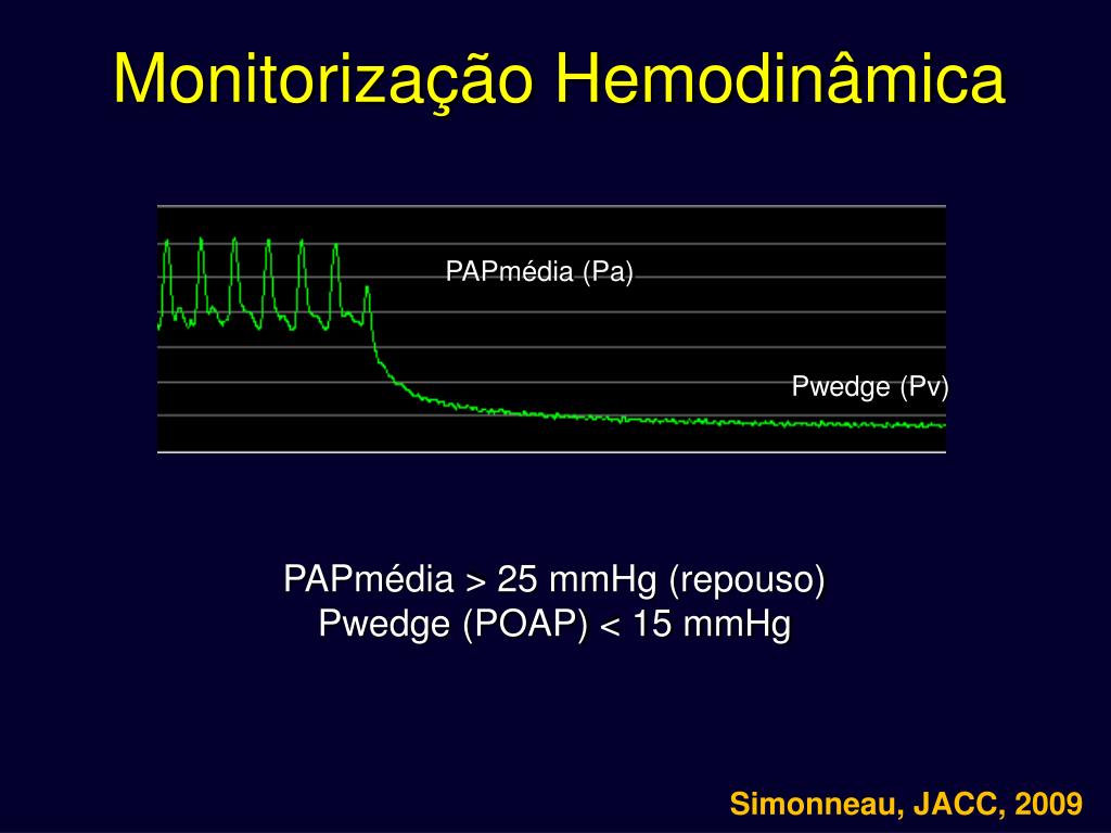 Monitorização Hemodinâmica PAPmédia(Pa) Pwedge (Pv) PAPmédia > 25 mmHg (repouso) Pwedge (POAP) < 15 mmHg Simonneau, JACC, 2009