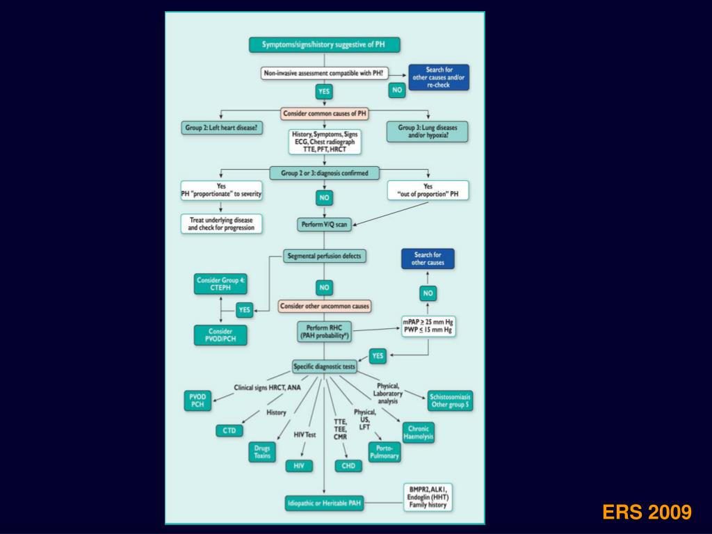HIPERTENSÃO PULMONARCLASSIFICAÇÃO DIAGNÓSTICA(4th WSPAH- Dana Point 2008) 1. Hipertensão Arterial Pulmonar • Idiopática • Hereditária BMPRII ALK1, endoglin Desconhecida • Induzida por drogas ou toxinas • Associada a: Doença do tecido conectivo; HIV Hipertensão portal Cardiopatias congênitas Hipertensão Persistente do neonato Esquistossomose 1’ Doença venooclusiva 3. HP com D. Parênquima/ Hipoxemia 4. HP por Doença Trombo-Embólica Crônica 5. HP Multifatorial ou Indeterminada 2. HP com Doença Cardíaca Esquerda • Sistólica • Diastólica • Valvar • Padrão obstrutivo / restritivo •Sarcoidose; Gaucher; Histiocitose; LAM; mielo-proliferativas Simonneau, JACC, 2009
