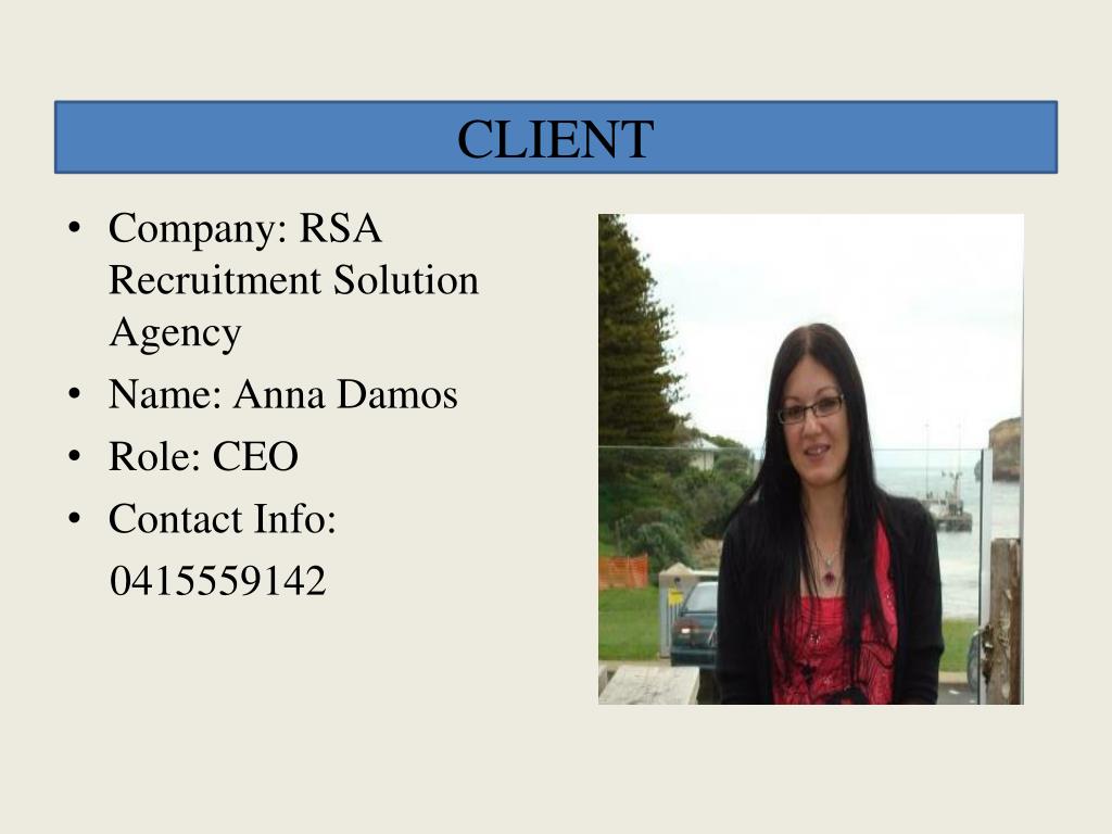 CLIENT • Company: RSA Recruitment Solution Agency • Name: Anna Damos • Role: CEO • Contact Info: 0415559142