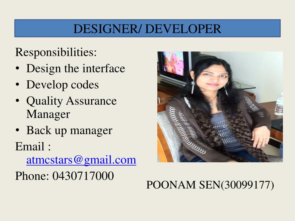 DESIGNER/ DEVELOPER Responsibilities: • Design the interface • Develop codes • Quality Assurance Manager • Back up manager Email : atmcstars@gmail.com Phone: 0430717000 POONAM SEN(30099177)