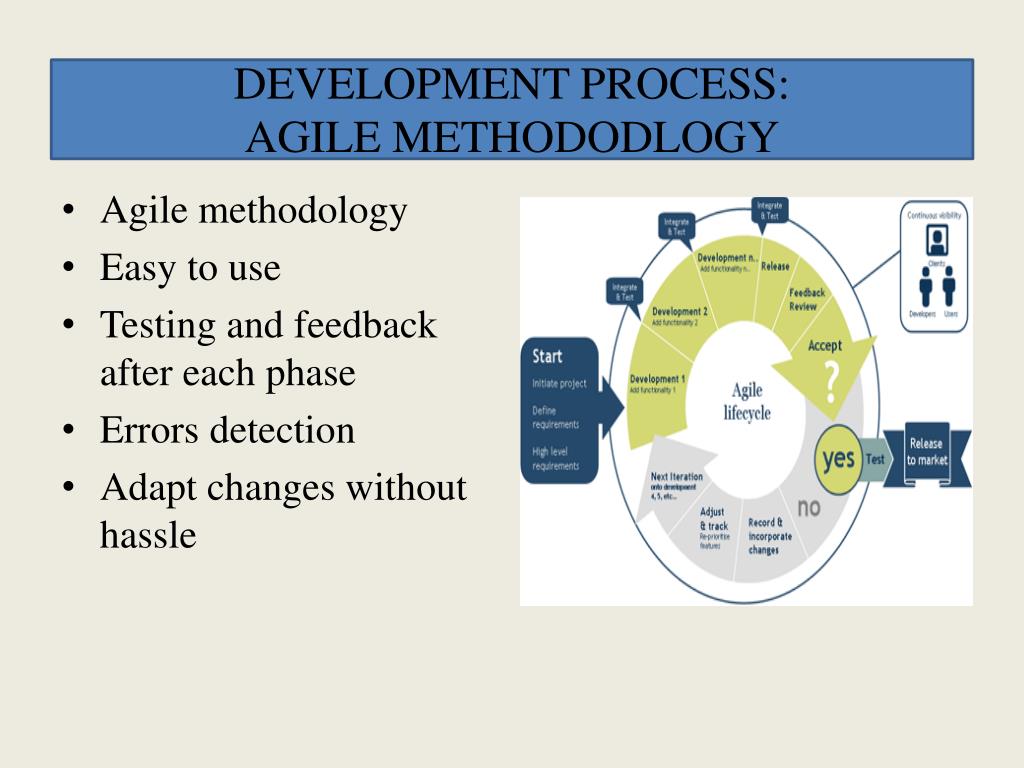 DEVELOPMENT PROCESS: AGILE METHODODLOGY • Agile methodology • Easy to use • Testing and feedback after each phase • Errors detection • Adapt changes without hassle