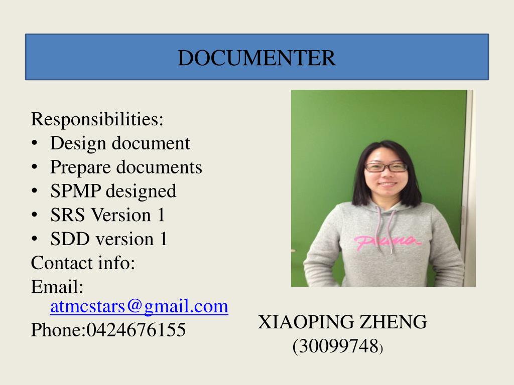 DOCUMENTER Responsibilities: • Design document • Prepare documents • SPMP designed • SRS Version 1 • SDD version 1 Contact info: Email: atmcstars@gmail.com Phone:0424676155 XIAOPING ZHENG (30099748)