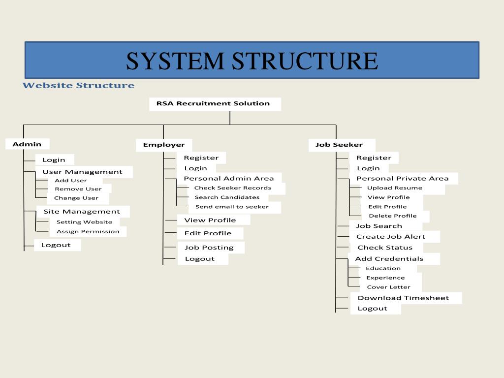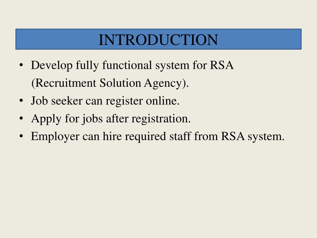 INTRODUCTION • Develop fully functional system for RSA (Recruitment Solution Agency). • Job seeker can register online. • Apply for jobs after registration. • Employer can hire required staff from RSA system.