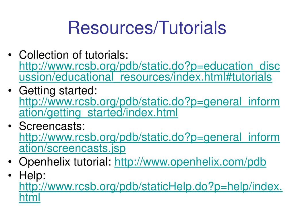Resources/Tutorials • Collection of tutorials: http://www.rcsb.org/pdb/static.do?p=education_discussion/educational_resources/index.html#tutorials • Getting started:http://www.rcsb.org/pdb/static.do?p=general_information/getting_started/index.html • Screencasts: http://www.rcsb.org/pdb/static.do?p=general_information/screencasts.jsp • Openhelix tutorial: http://www.openhelix.com/pdb • Help: http://www.rcsb.org/pdb/staticHelp.do?p=help/index.html