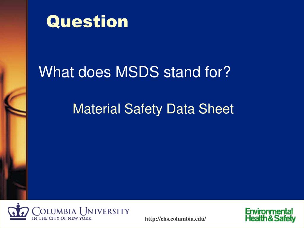 Question What does MSDS stand for? Material Safety Data Sheet