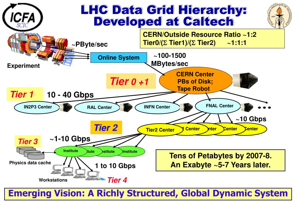 Tier2 Center Tier2 Center Tier2 Center Tier2 Center Tier2 Center LHC Data Grid Hierarchy:Developed at Caltech CERN/Outside Resource Ratio ~1:2Tier0/( Tier1)/( Tier2) ~1:1:1 ~PByte/sec ~100-1500 MBytes/sec Online System Experiment CERN Center PBs of Disk; Tape Robot Tier 0 +1 Tier 1 10 - 40 Gbps FNAL Center IN2P3 Center INFN Center RAL Center ~10 Gbps Tier 2 ~1-10 Gbps Tier 3 Institute Institute Institute Institute Tens of Petabytes by 2007-8.An Exabyte ~5-7 Years later. Physics data cache 1 to 10 Gbps Tier 4 Workstations Emerging Vision: A Richly Structured, Global Dynamic System
