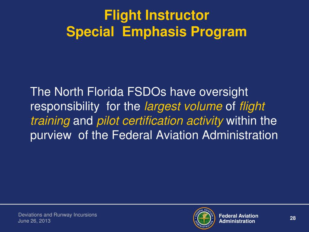 Flight InstructorSpecial Emphasis Program The North Florida FSDOs have oversight responsibility for the largest volume of flight training and pilot certification activity within the purview of the Federal Aviation Administration