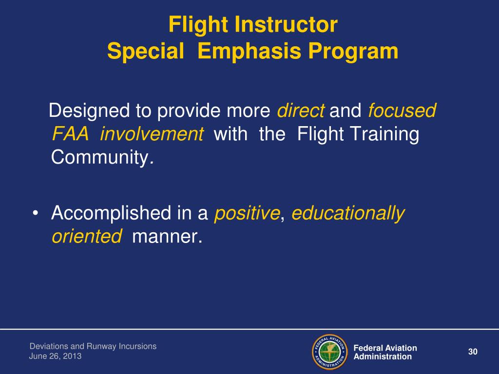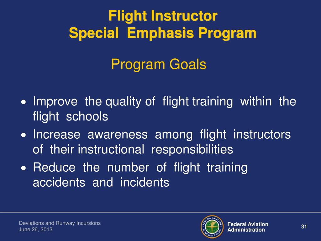 Flight InstructorSpecial Emphasis Program Program Goals • Improve the quality of flight training within the flight schools • Increase awareness among flight instructors of their instructional responsibilities • Reduce the number of flight training accidents and incidents