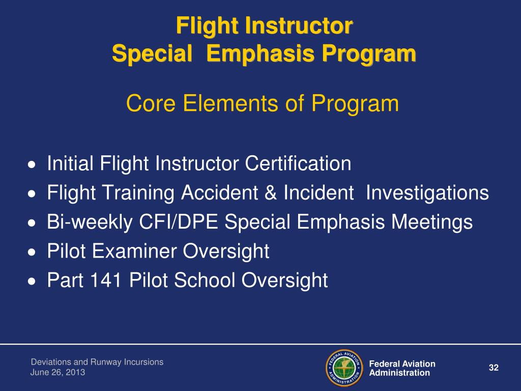 Flight InstructorSpecial Emphasis Program Core Elements of Program • Initial Flight Instructor Certification • Flight Training Accident & Incident Investigations • Bi-weekly CFI/DPE Special Emphasis Meetings • Pilot Examiner Oversight • Part 141 Pilot School Oversight