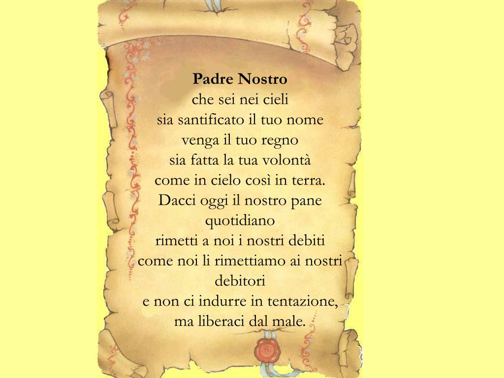 Padre Nostro che sei nei cieli sia santificato il tuo nome venga il tuo regno sia fatta la tua volontà come in cielo così in terra. Dacci oggi il nostro pane quotidiano rimetti a noi i nostri debiti come noi li rimettiamo ai nostri debitori e non ci indurre in tentazione, ma liberaci dal male.