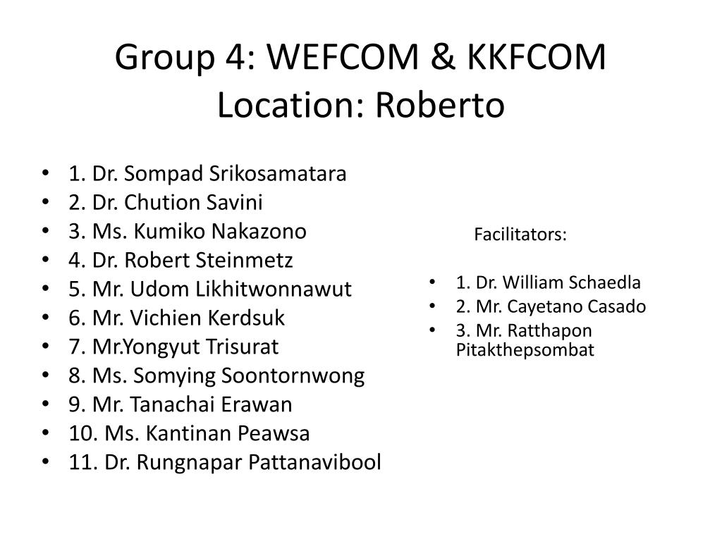 1. Dr. Sompad Srikosamatara 2. Dr. Chution Savini 3. Ms. Kumiko Nakazono 4. Dr. Robert Steinmetz 5. Mr. Udom Likhitwonnawut 6. Mr. Vichien Kerdsuk 7. Mr.Yongyut Trisurat 8. Ms. Somying Soontornwong 9. Mr. Tanachai Erawan 10. Ms. Kantinan Peawsa 11. Dr. Rungnapar Pattanavibool Facilitators: 1. Dr. William Schaedla 2. Mr. Cayetano Casado 3. Mr. Ratthapon Pitakthepsombat Group 4: WEFCOM & KKFCOMLocation: Roberto