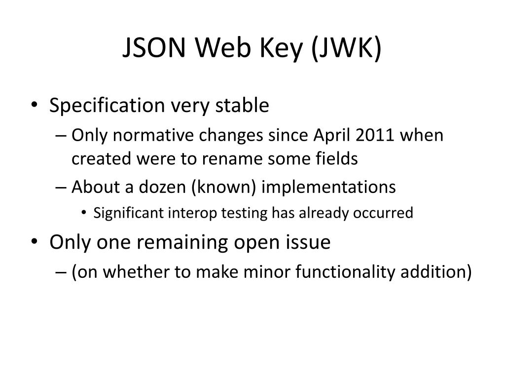 JSON Web Key (JWK) • Specification very stable • Only normative changes since April 2011 when created were to rename some fields • About a dozen (known) implementations • Significant interop testing has already occurred • Only one remaining open issue • (on whether to make minor functionality addition)
