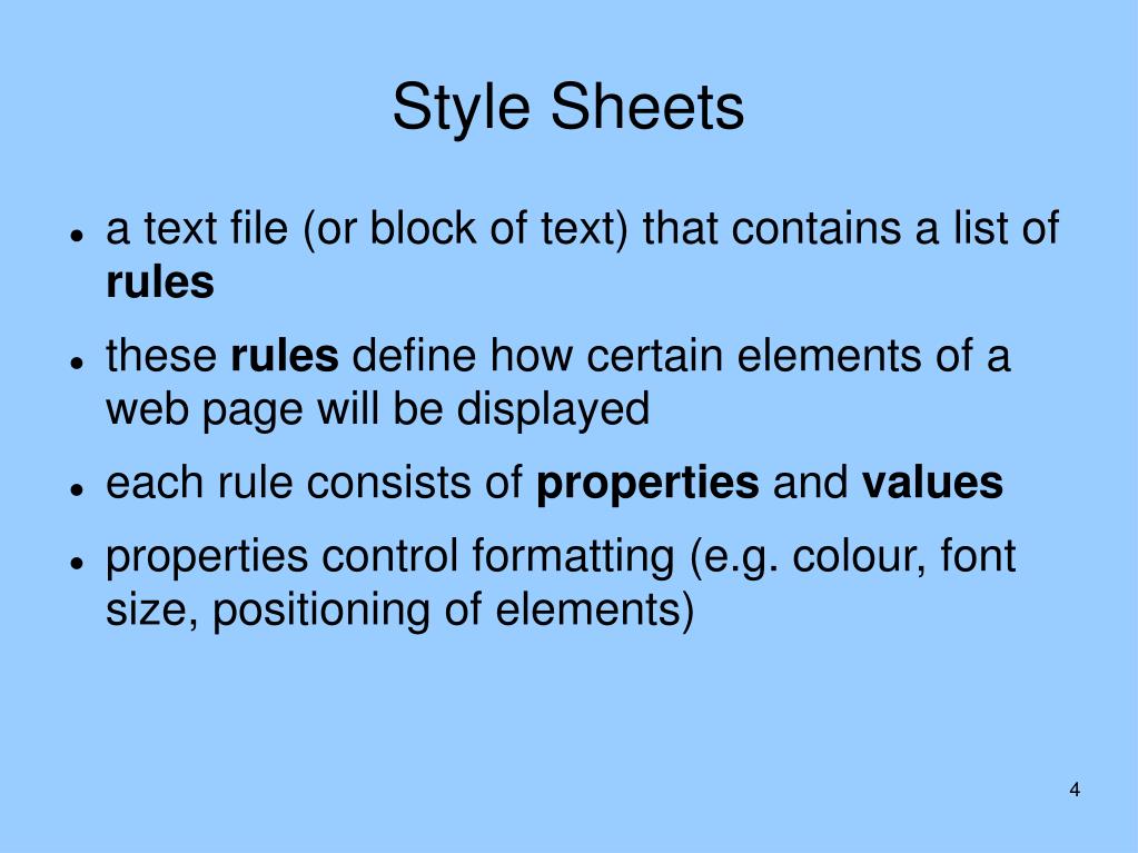 Style Sheets • a text file (or block of text) that contains a list of rules • these rules define how certain elements of a web page will be displayed • each rule consists of properties and values • properties control formatting (e.g. colour, font size, positioning of elements)