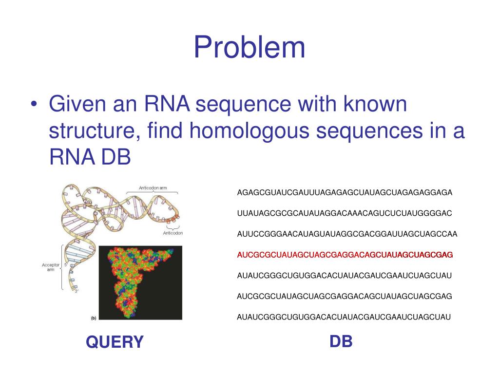 Problem • Given an RNA sequence with known structure, find homologous sequences in a RNA DB AGAGCGUAUCGAUUUAGAGAGCUAUAGCUAGAGAGGAGA UUAUAGCGCGCAUAUAGGACAAACAGUCUCUAUGGGGAC AUUCCGGGAACAUAGUAUAGGCGACGGAUUAGCUAGCCAA AUCGCGCUAUAGCUAGCGAGGACAGCUAUAGCUAGCGAG AUCGCGCUAUAGCUAGCGAGGACAGCUAUAGCUAGCGAG AUAUCGGGCUGUGGACACUAUACGAUCGAAUCUAGCUAU AUCGCGCUAUAGCUAGCGAGGACAGCUAUAGCUAGCGAG AUAUCGGGCUGUGGACACUAUACGAUCGAAUCUAGCUAU DB QUERY