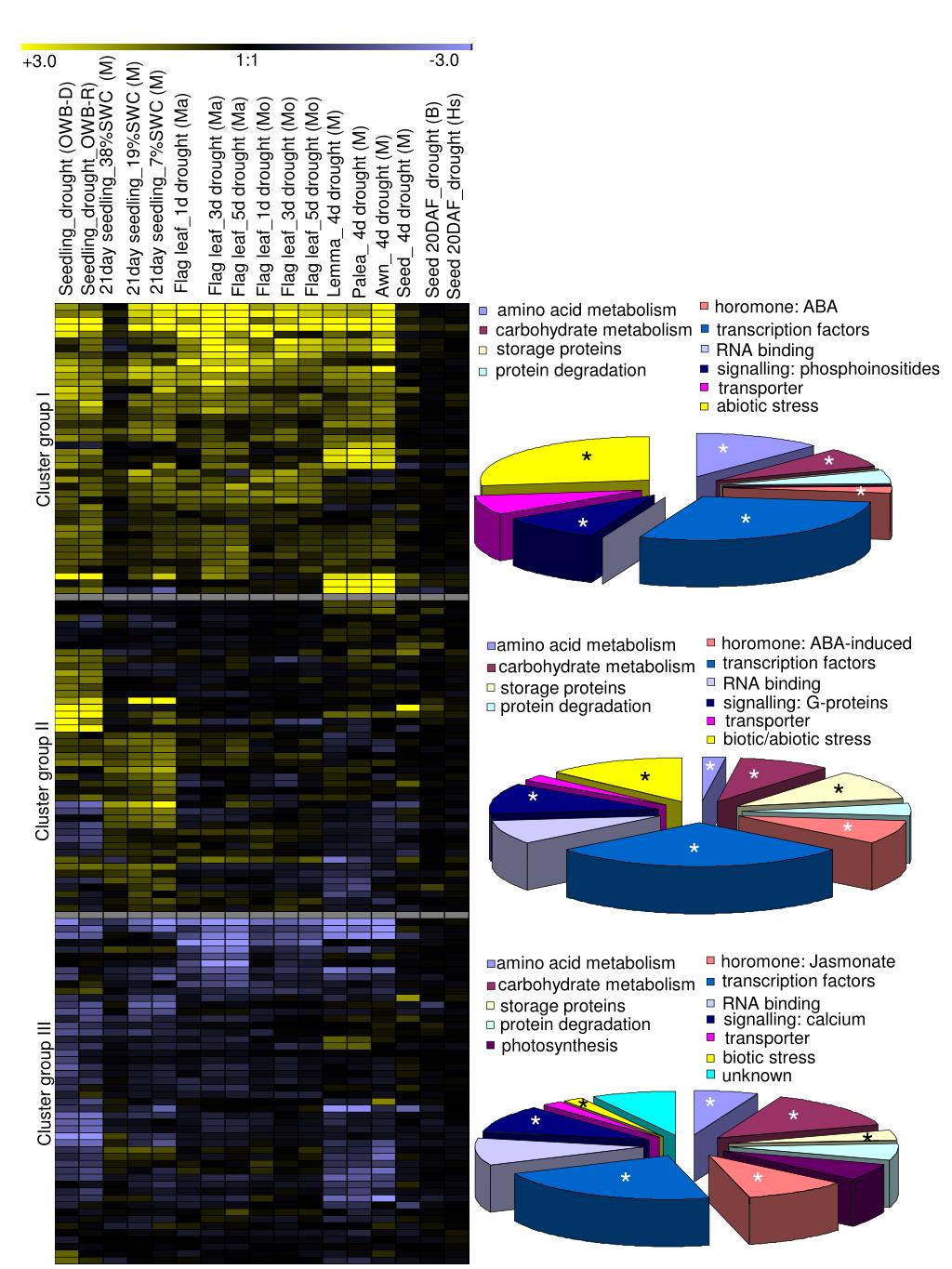 horomone: Jasmonate amino acid metabolism transcription factors carbohydrate metabolism RNA binding storage proteins signalling: calcium protein degradation transporter photosynthesis biotic stress unknown 1:1 -3.0 +3.0 Flag leaf_1d drought (Ma) 21day seedling_38%SWC (M) 21day seedling_7%SWC (M) 21day seedling_19%SWC (M) Seedling_drought_OWB-R) Seedling_drought (OWB-D) Flag leaf_3d drought (Ma) Flag leaf_1d drought (Mo) Flag leaf_5d drought (Ma) Flag leaf_3d drought (Mo) Flag leaf_5d drought (Mo) Lemma_ 4d drought (M) Awn_ 4d drought (M) Seed_ 4d drought (M) Seed 20DAF_drought (B) Palea_ 4d drought (M) Seed 20DAF_drought (Hs) horomone: ABA amino acid metabolism transcription factors carbohydrate metabolism storage proteins RNA binding signalling: phosphoinositides protein degradation transporter abiotic stress Cluster group I * * * * * * horomone: ABA-induced amino acid metabolism transcription factors carbohydrate metabolism RNA binding storage proteins signalling: G-proteins protein degradation transporter biotic/abiotic stress * * * Cluster group II * * * * Cluster group III * * * * * * *