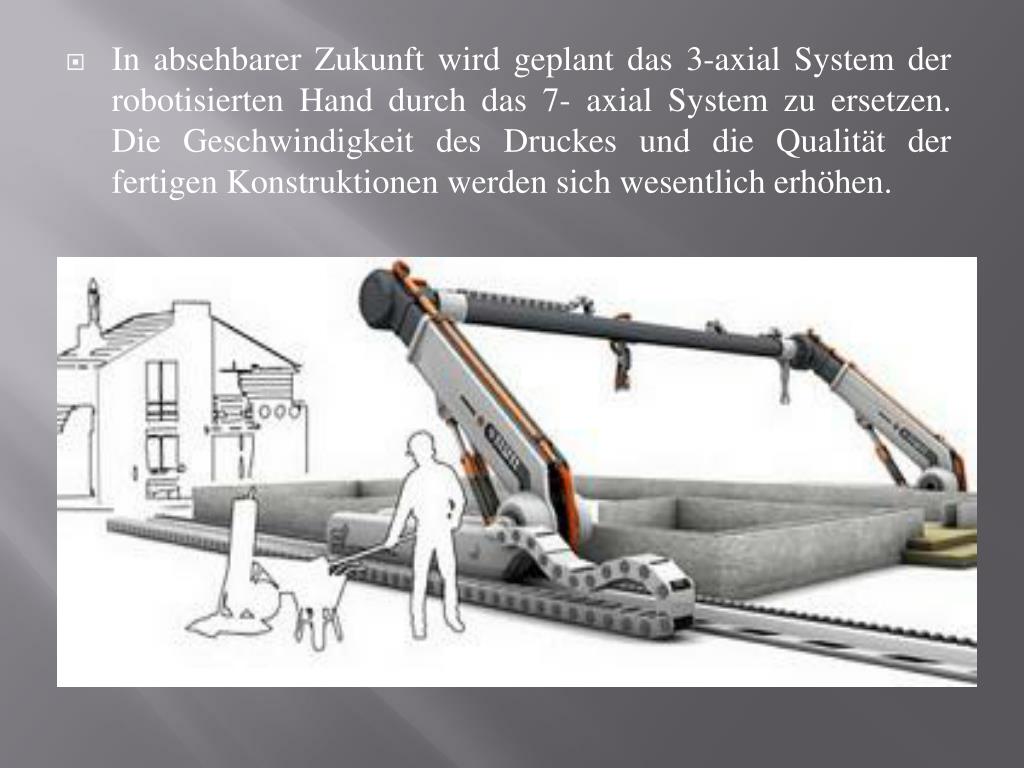 In absehbarer Zukunft wird geplant das 3-axial System der robotisierten Hand durch das 7- axial System zu ersetzen. Die Geschwindigkeit des Druckes und die Qualität der fertigen Konstruktionen werden sich wesentlich erhöhen.
