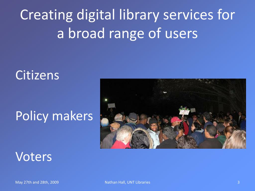 Creating digital library services for a broad range of users Citizens Policy makers Voters Nathan Hall, UNT Libraries
