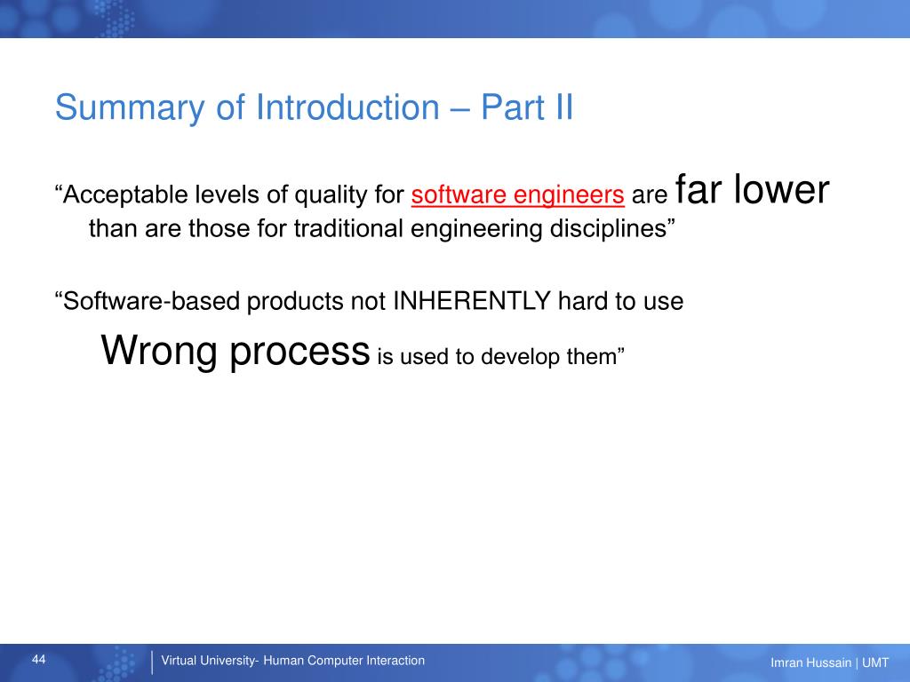 Summary of Introduction – Part II “Acceptable levels of quality for software engineers are far lower than are those for traditional engineering disciplines” “Software-based products not INHERENTLY hard to use Wrong process is used to develop them”