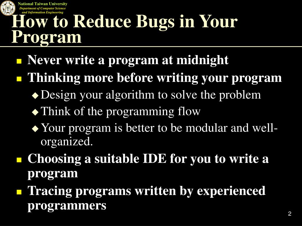 Introduction to Debugging Techniques in Visual C++ 6.0. Speaker: Yao-Ting Huang Advisor: Kun-Mao Chao. National Taiwan University Department of Computer Science & Information Engineering Algorithms and Computational Biology Lab. How to Reduce Bugs in Your Program.
