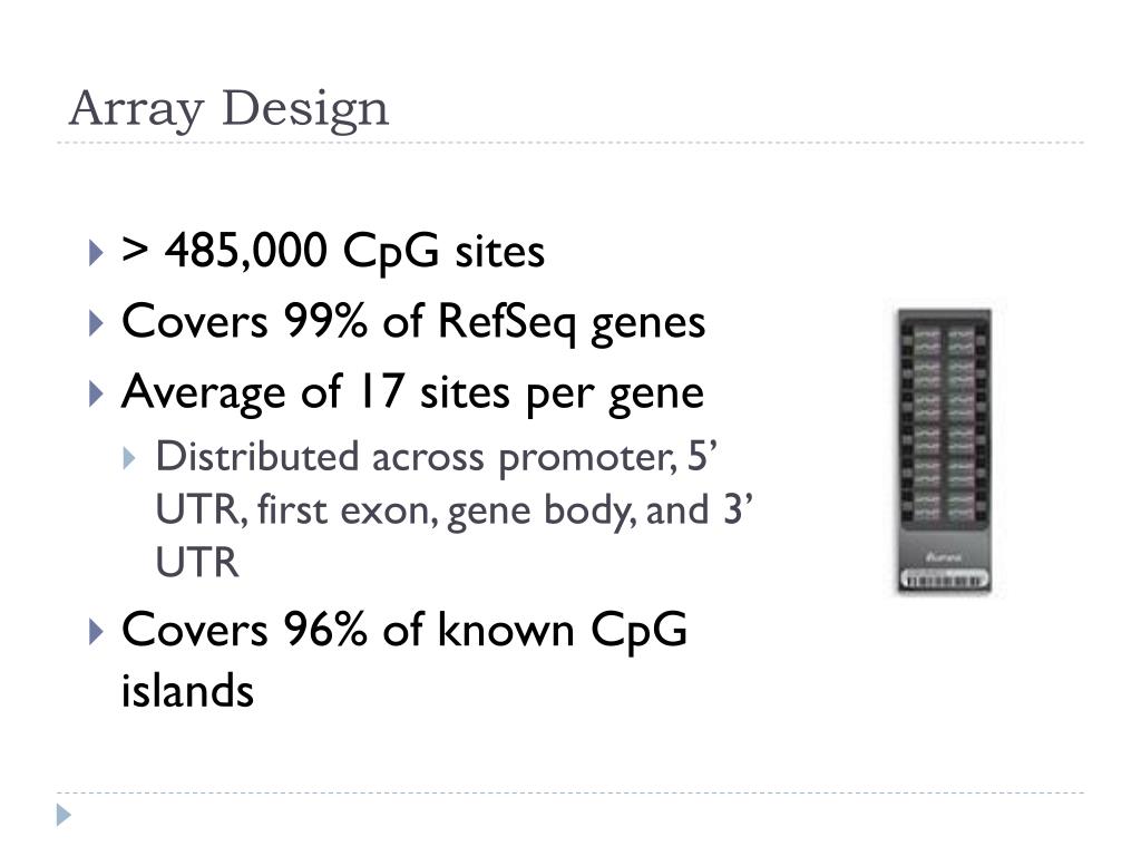 Array Design • > 485,000 CpG sites • Covers 99% of RefSeq genes • Average of 17 sites per gene • Distributed across promoter, 5’ UTR, first exon, gene body, and 3’ UTR • Covers 96% of known CpG islands