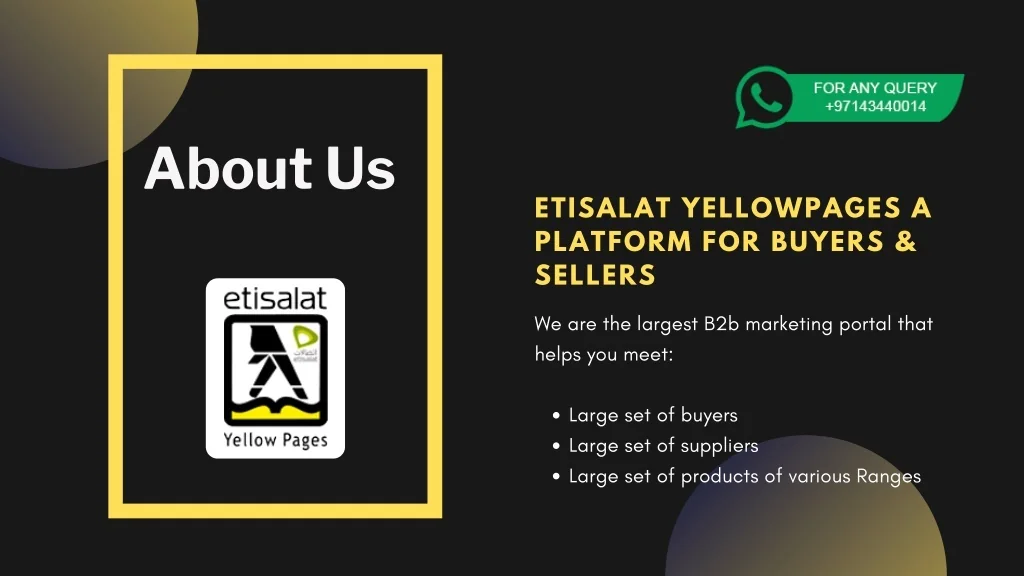 About Us ETISALAT YELLOWPAGES A PLATFORM FOR BUYERS & SELLERS We are the largest B2b marketing portal that helps you meet: Large set of buyers Large set of suppliers Large set of products of various Ranges