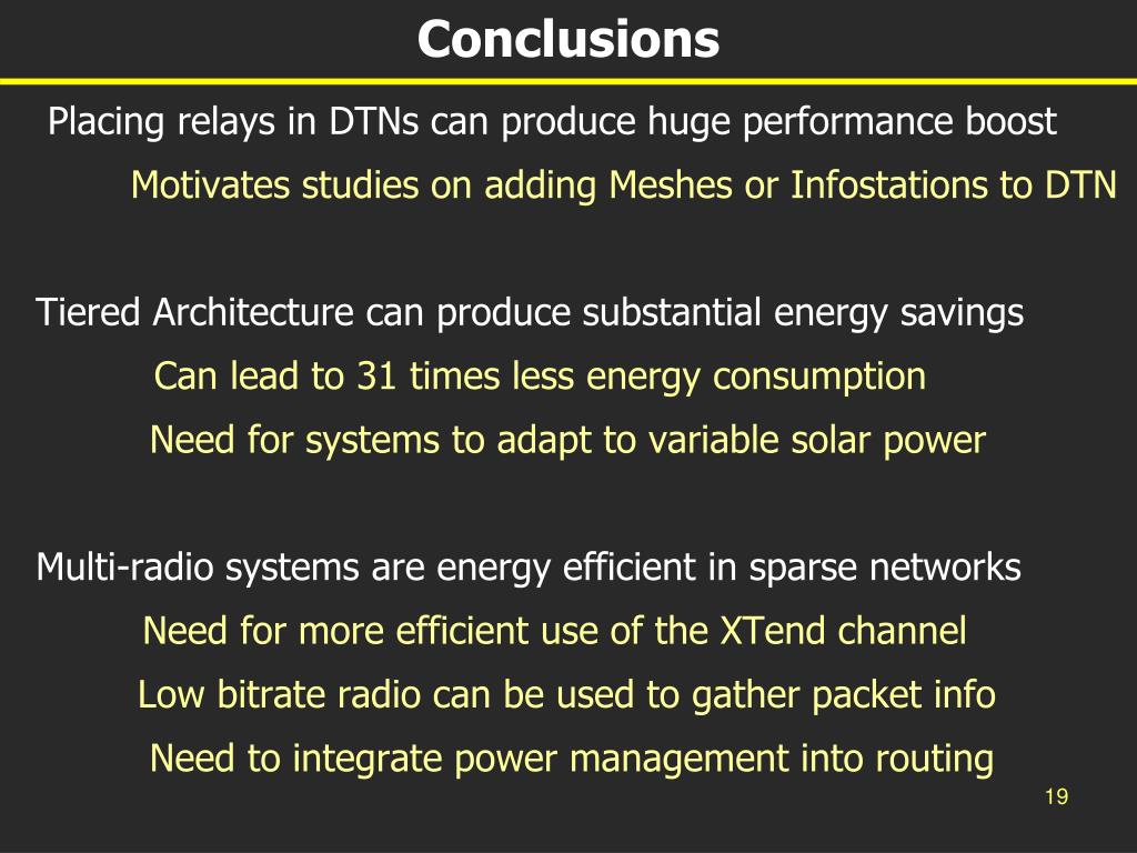Conclusions • Placing relays in DTNs can produce huge performance boost • Motivates studies on adding Meshes or Infostations to DTN • Tiered Architecture can produce substantial energy savings • Can lead to 31 times less energy consumption • Need for systems to adapt to variable solar power • Multi-radio systems are energy efficient in sparse networks • Need for more efficient use of the XTend channel • Low bitrate radio can be used to gather packet info • Need to integrate power management into routing
