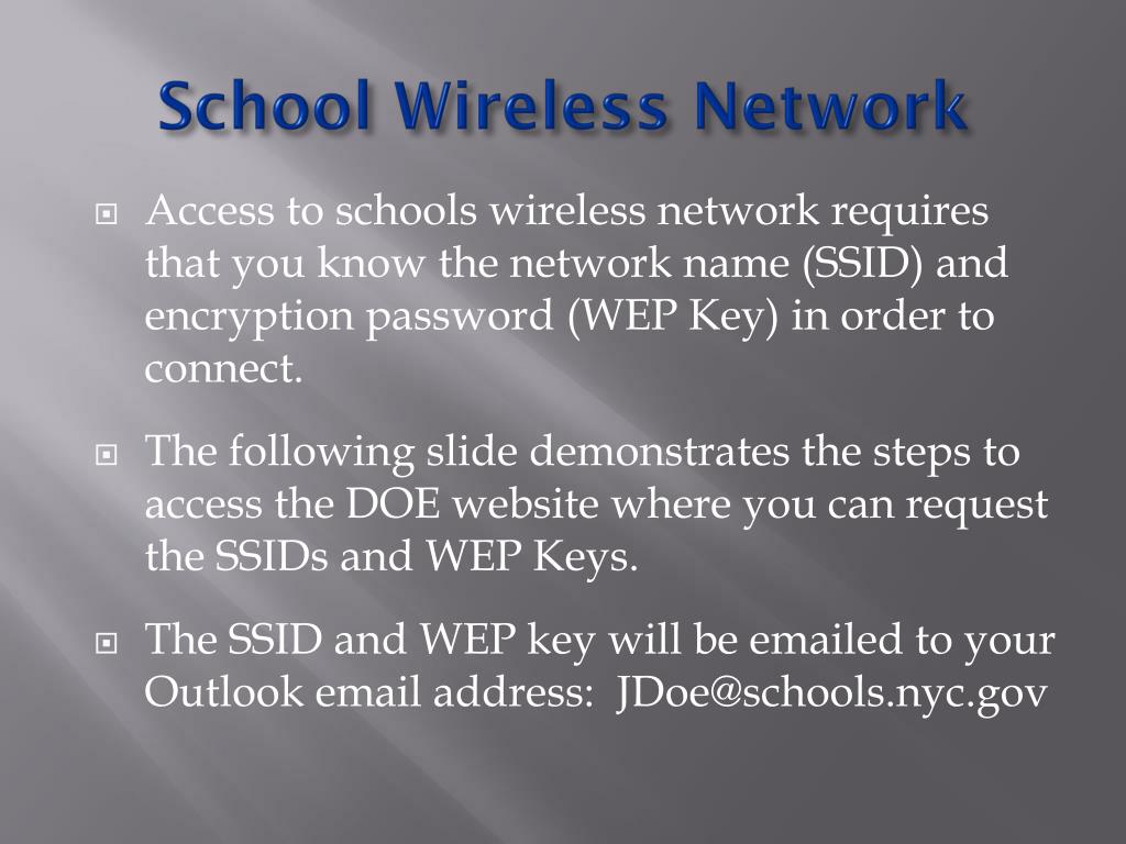 School Wireless Network • Access to schools wireless network requires that you know the network name (SSID) and encryption password (WEP Key) in order to connect. • The following slide demonstrates the steps to access the DOE website where you can request the SSIDs and WEP Keys. • The SSID and WEP key will be emailed to your Outlook email address: JDoe@schools.nyc.gov
