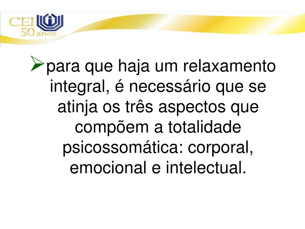 para que haja um relaxamento integral, é necessário que se atinja os três aspectos que compõem a totalidade psicossomática: corporal, emocional e intelectual.