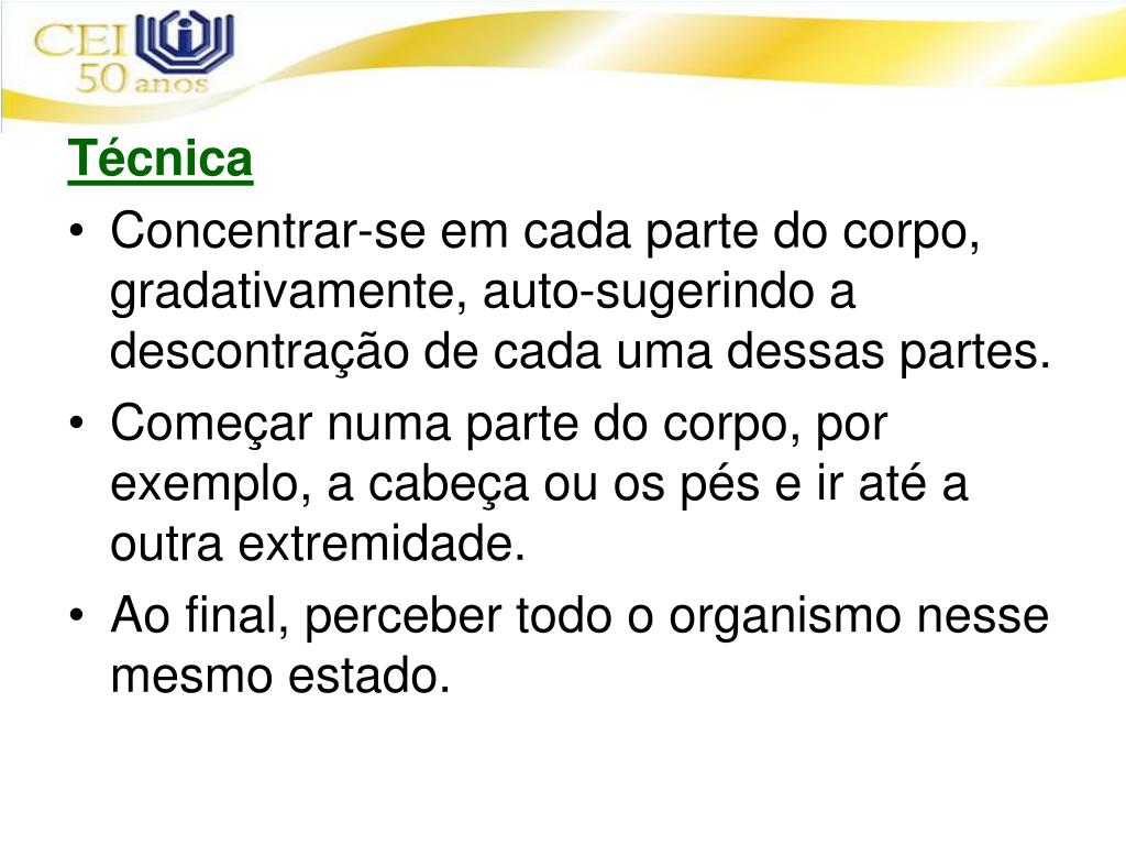Técnica • Concentrar-se em cada parte do corpo, gradativamente, auto-sugerindo a descontração de cada uma dessas partes. • Começar numa parte do corpo, por exemplo, a cabeça ou os pés e ir até a outra extremidade. • Ao final, perceber todo o organismo nesse mesmo estado.