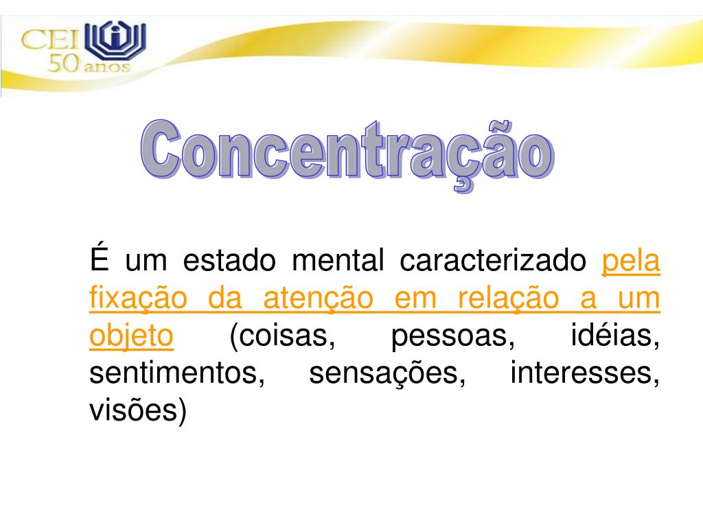 Concentração É um estado mental caracterizado pela fixação da atenção em relação a um objeto(coisas, pessoas, idéias, sentimentos, sensações, interesses, visões)
