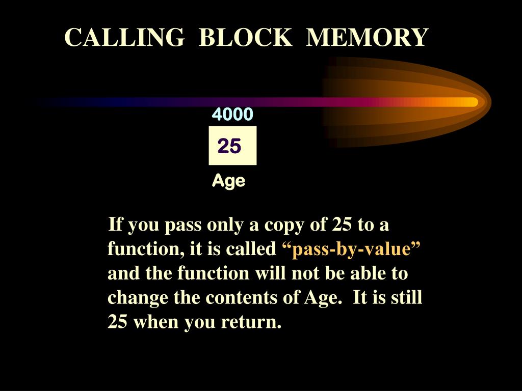 4000 25 Age CALLING BLOCK MEMORY If you pass only a copy of 25 to a function, it is called “pass-by-value”and the function will not be able to change the contents of Age. It is still 25 when you return.