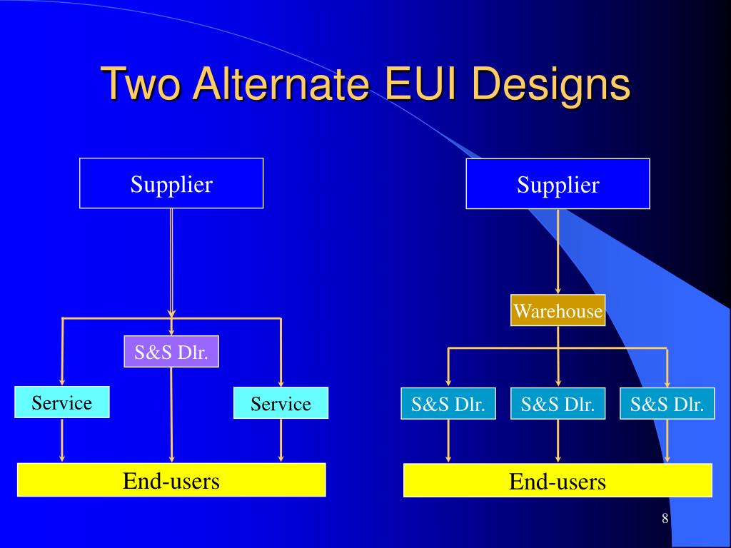 Two Alternate EUI Designs Supplier Supplier Warehouse S&S Dlr. Service Service S&S Dlr. S&S Dlr. S&S Dlr. End-users End-users