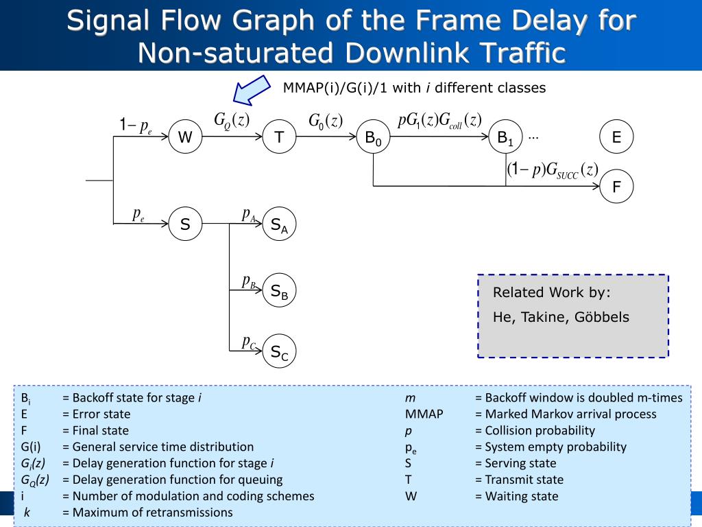 Signal Flow Graph of the Frame Delay forNon-saturated Downlink Traffic MMAP(i)/G(i)/1 with i different classes W T B0 B1 E … F Related Work by: He, Takine, Göbbels S SA SB SC Bi = Backoff state for stage iE = Error stateF = Final stateG(i) = General service time distributionGi(z) = Delay generation function for stage iGQ(z) = Delay generation function for queuingi = Number of modulation and coding schemes k = Maximum of retransmissions m = Backoff window is doubled m-timesMMAP = Marked Markov arrival processp= Collision probabilitype = System empty probabilityS = Serving stateT = Transmit stateW = Waiting state
