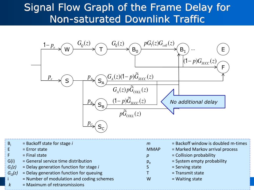 Signal Flow Graph of the Frame Delay forNon-saturated Downlink Traffic W T B0 B1 E … F S SA SB Coefficients of GC dependon GSUCC and GCOLL SC Bi = Backoff state for stage iE = Error stateF = Final stateG(i) = General service time distributionGi(z) = Delay generation function for stage iGQ(z) = Delay generation function for queuingi = Number of modulation and coding schemes k = Maximum of retransmissions m = Backoff window is doubled m-timesMMAP = Marked Markov arrival processp= Collision probabilitype = System empty probabilityS = Serving stateT = Transmit stateW = Waiting state